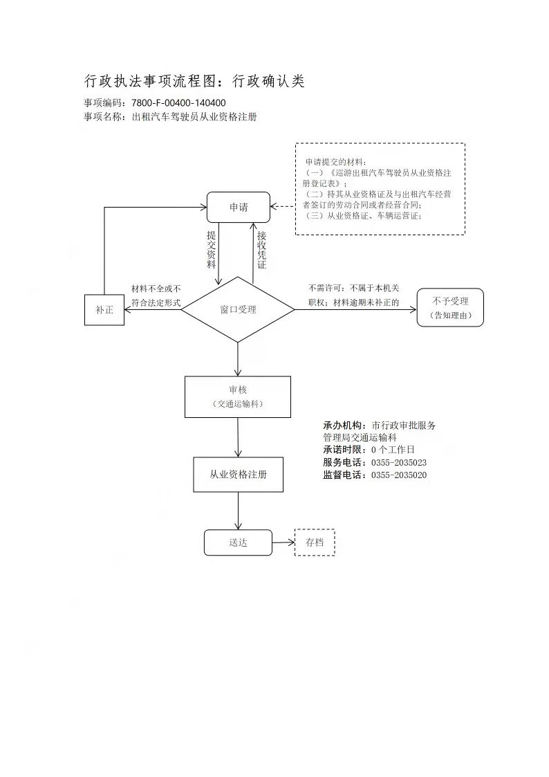 | 行使内容 | 取得从业资格证的出租汽车驾驶员,应当经出租汽车行政主管部门从业资格注册后,方可从事出租汽车客运服务 | 权限划分 | 无 |