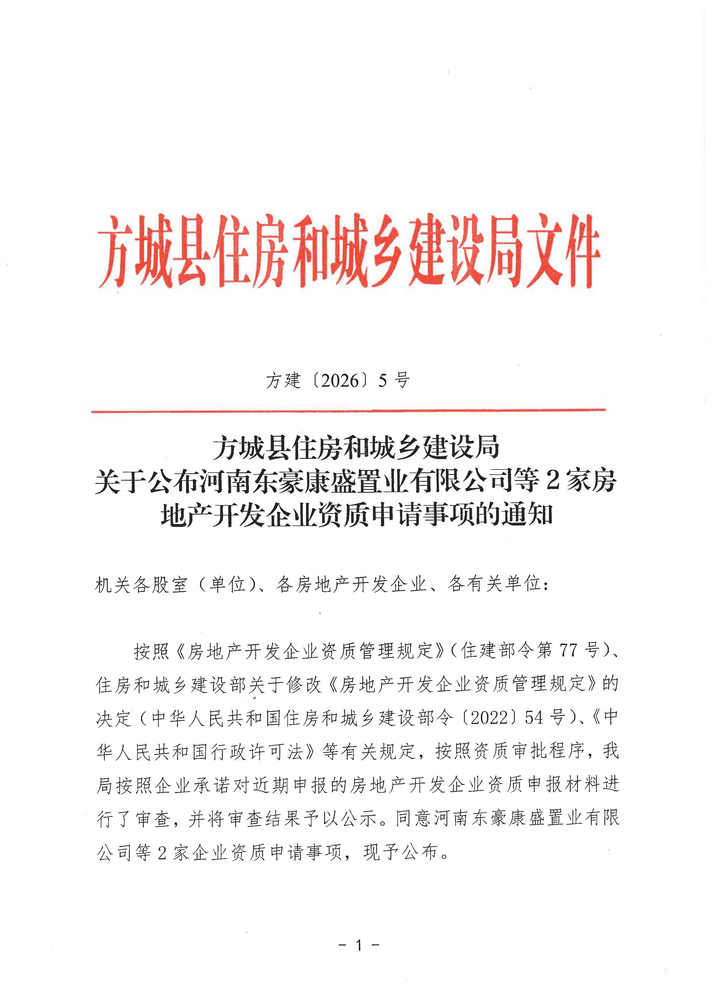 | 标 题 | 关于公布河南东豪康盛置业有限公司等2家房地产开发企业资质申请事项的通知 | 有 效 性 | |
